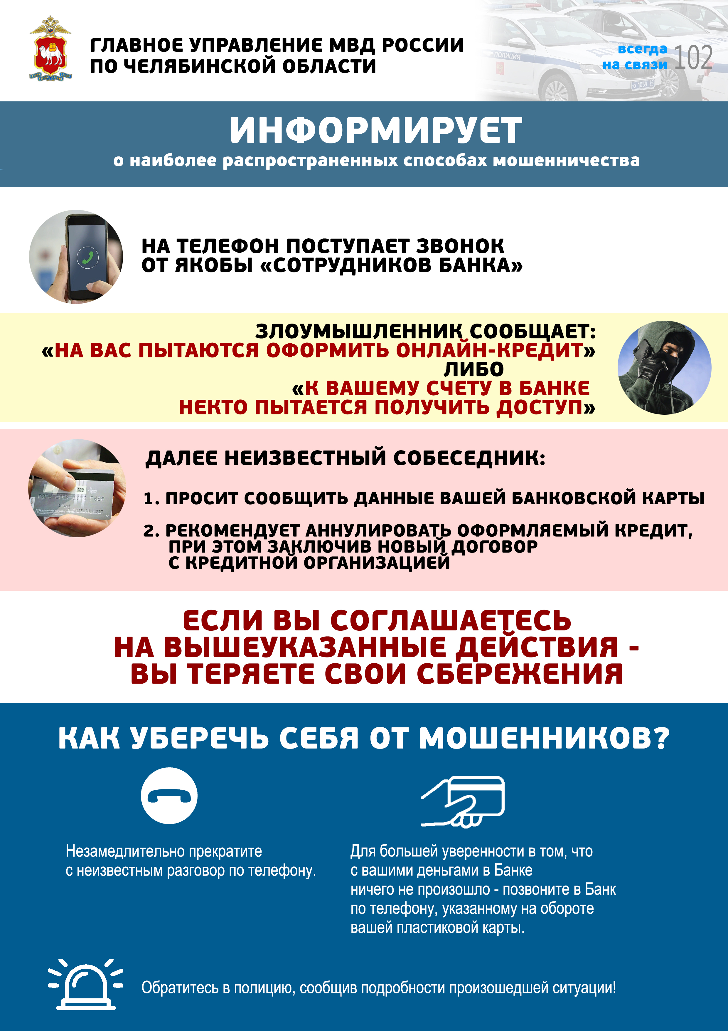 ГУ МВД России по Челябинской области подготовили для вас памятки, которые помогут вас избежать мошенников.